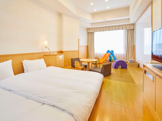 中には赤ちゃんが寝ても危なくないローベッドとキッズスペースのついたプレジャールームも。(画像右側)